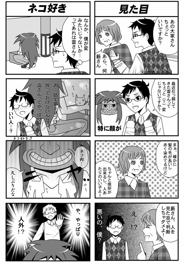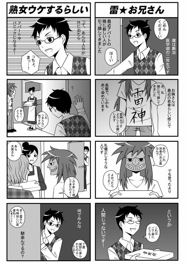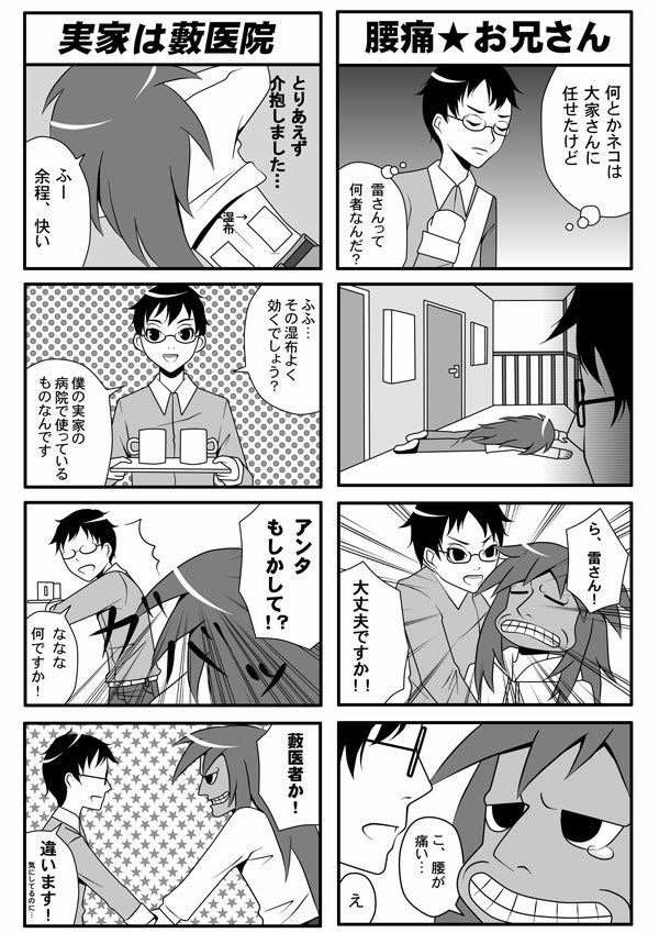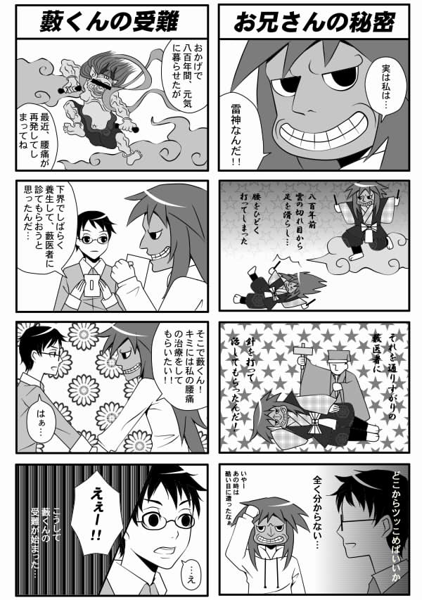 地上にやってきた雷神様と医学部の学生、藪君のほのぼの四コマ漫画。